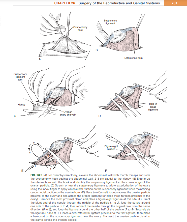 در طی جراحی عقیم سازی به روش مرسوم (3 پنس ) که در کتب رفرنس دامپزشکی مورد توصیه می باشد ، بعد از تعیین محل برش پوست ، زیر پوست بوسیله تیغ اسکالپل جراحی صورت گرفته با خونبندی توسط پنس های هالستد – موسکیتو سپس با پیدا کردن خط برش وسط لینه آلبا با تیغ و سپس ادامه برش با قیچی متزنبام به یک فضای برش یافته حدود ثلثی از فاصله ناف تا پیوبیس می رسیم .با استفاده از این رهیافت جراحی اقدام به برداشت شاخ رحمی و خروج آن از منطقه برش داده شده که در این فرایند الزامی مبنی بر لزوم همکاری کمک جراح به هدف فشرده سازی دیواره شکم و حفظ آن برای خروج بهتر تخمدان از محوطه شکمی و همچنین کمک به نگهداری تخمدان خارج شده برای جلوگیری از برگشت تخمدان به درون محوطه شکمی به دلیل آنکه لیگامنت ها و بافت های مجاور تخمدان با قابلیت ریترکت شدن امکان برگشت به درون شکم را داشته و خود این امر می تواند منجر به افزایش مدت زمان جراحی و میزان برش شکمی برای پیدا کردن تخمدان شود .در روش مرسوم بعد از رسید به فضای بطنی شاخ رحم سمت چپ با کشیدن تخمدان برای شل کردن و پاره کردن ساسپنسوی لیگامنت شروع به باز کردن فضایی در مزواوریوم اقدام به کلمپ گذاری می شود . در این روش پنس اول بر روی پدیکل و پنس های دوم و سوم هم به تناسب در نزدیکی پنس اول قرار گرفته و سپس در محل پنس میانی لیگاتور زده شده و ساسپنسوری لیگامنت را قطع میکنند.